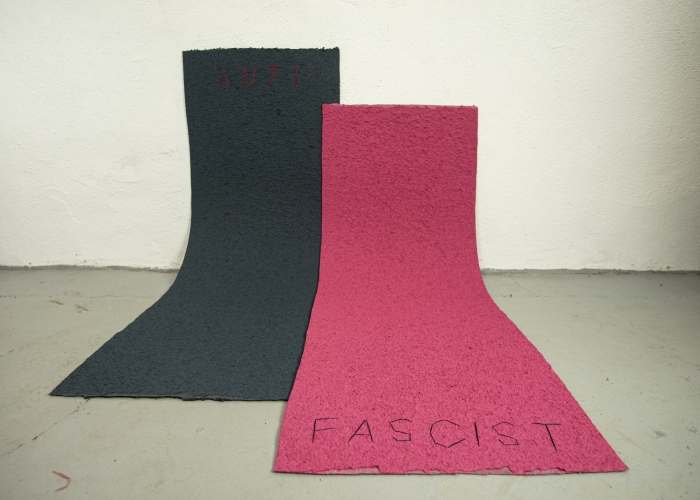 This sentiment of being othered is shared by Xarabyte in their red and black diptych Sprayings 1& 2 (State of Affairs), 2020. They shredded clothing to create a paper pulp, which produced an activated surface in their handmade paper panels. This visceral quality, coupled with the handstitched "ANTI" in red thread on the left black panel and "FASCIST" in black thread on the right red panel, expresses Xarabyte’s desire for human equality. The work is reminiscent of the antifascist flag associated with Antifa, a loose movement of activists who demonstrate against authoritarian, racist, xenophobic, homophobic, and othered communities.