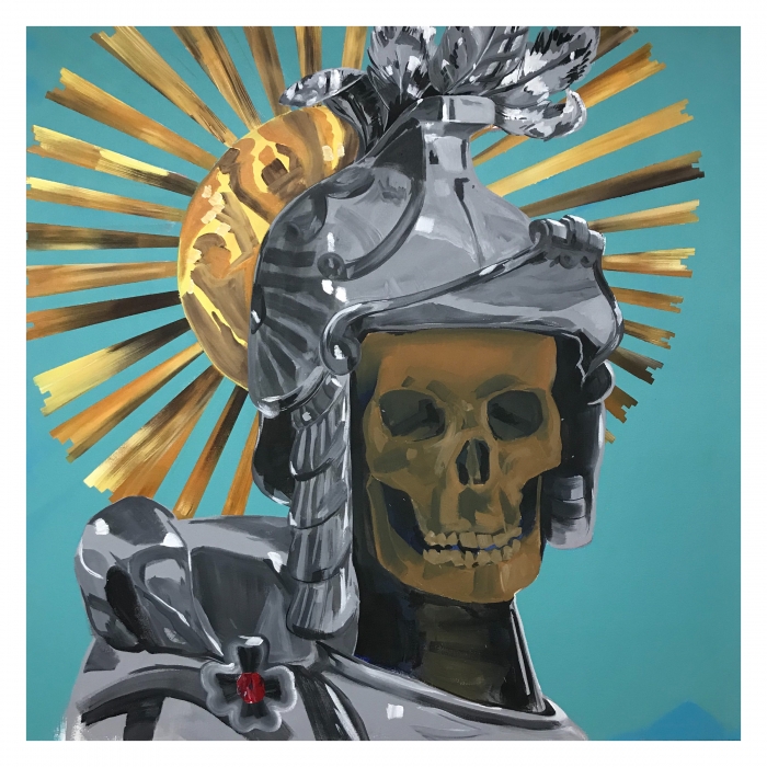 Mark Batongmalaque challenges himself to represent beauty, death, and the ephemeralness of their coexistence. The profile skeleton staring into the eyes of a figure in The Painful Path of Empathy, 2019, conveys humanity's shared experiences of grasping at these moments as they slip through our fingers, fading into memory, and our struggles to understand someone else’s pain. Dressed in a royal purple robe with folds of drapery framing its smiling chipped tooth grinning face accentuates the bedazzled floral crown and neck cuff worn by the skeleton in We Only Matter to Us, 2020. This painting and the portrait of a skeleton in All that Remains, 2020, dressed as a knight wearing armor designed with Art Nouveau flair and framed by a dazzling Baroque sort of halo, evoke seventeenth-century Dutch vanitas theme paintings. Yet, Batongmalaque’s absurdist humor juxtaposing the underbelly of vanity exemplified by skeletons with fanciful pop culture interpretations of art historical imagery ingratiates viewers and encourages us to reflect on the brevity of life, like the Dutch painters intended.