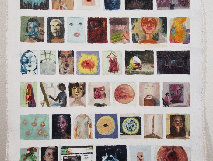 Megan Koth followed posts suggested by her Instagram feed and Google image results from searching her name to formulate a wormhole linking more and more disparate content to her identity the further she burrowed. She appropriated these mediated photos of herself, her paintings, her friends, and then unrelated imagery seemingly inexplicably associated with her name to craft "self-portraits" in her Interface, 2020, paintings. The resulting scrolls of diminutive faces read like a visual diagram. The process of working in her studio to paint a mediated detail of her paintings, the actual compositions stored a few feet away, creates a dynamic self-referential relationship both in her creative process and spectatorship.