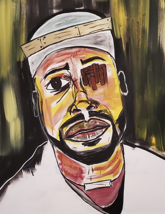 To facilitate the creative transformation process as he painted the self-portraits included in the exhibition, James Shawn Crum intertwined narratives from Classical mythology with African legends warning of feuding brothers’ misadventures and demise. These interlaced stories are painfully evident in Crum’s compositions on exhibit, none more so than his psychological self-portrait Melancholy, 2019, in which his feelings of otherness are papabile. Symbolized by a beleaguered facial expression and one eye boarded shut, his fear of being seen while seemingly pleading with spectators to see and consequently value his humanity as a black man living in America.