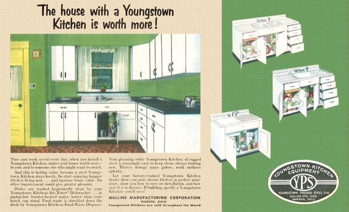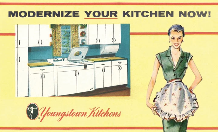 My knowledge of Youngstown was limited to childhood memories of sitting in the backseat of my parent's car. I remember looking out the window at the lovely homes from a forgotten era along 5th Avenue, and the lurching remains of Youngstown Sheet and Tube. I began to research the industrial history of the city. I discovered Bruce Springsteen’s ode to the mill workers. The visual image portrayed in his lyrics reminded me of that childhood memory of the rusted mill. While there were plenty of stories about Youngstown to investigate, I was still looking for a topic that would further my understanding of the city and address gender equality themes. I eventually discovered Mullins Manufacturing, which designed and fabricated Modern kitchens. The portrayal of women in company advertisements fascinated me. These images reminded me of the stories my grandmother told about her youth during the Fifties. I pictured women wearing swing dresses topped with twin set cardigan sweaters and these feminine ladies' ongoing struggle for gender equality.