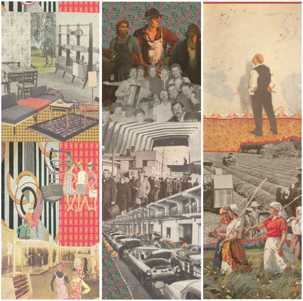 I created Comrades Nikifor and Ksenia in memory of my Ukrainian grandparents. This triptych portrays an imaginary realism of reality and fanciful family lore about their life. I fabricated the compositions by abstracting and repurposing imagery from the Wende collection of Socialist Realism paintings, complementing this with details from some found historical ephemera and others from my collection of family photos, Soviet clothing and lifestyle magazines, and Ukrainian material culture.