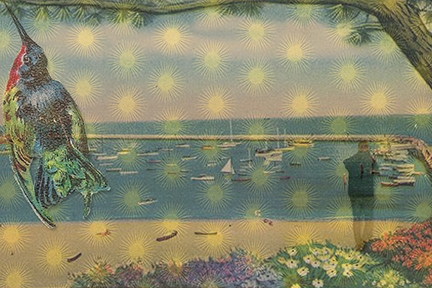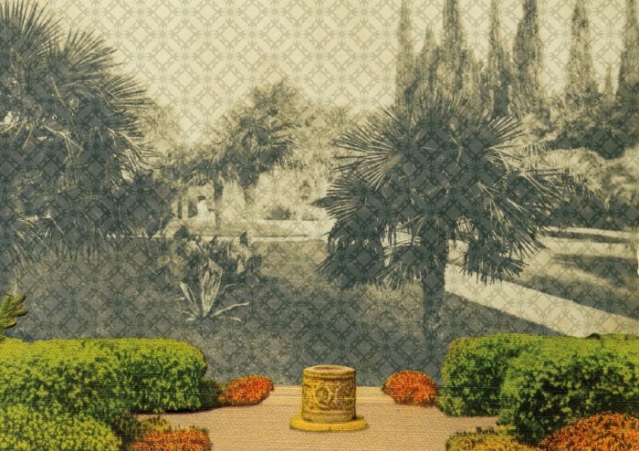 Super Natural, on view at The National Centre for Contemporary Art in Moscow, Russia, is a series of 43 digital prints and multichannel video projections. The compositions, hung salon style, began as multi-layered digital files. To create her maximalist, highly decorative “photographic compositions,” Vanderpool sourced her imagery from vintage postcards, interior design textile patterns, and her own photographs.